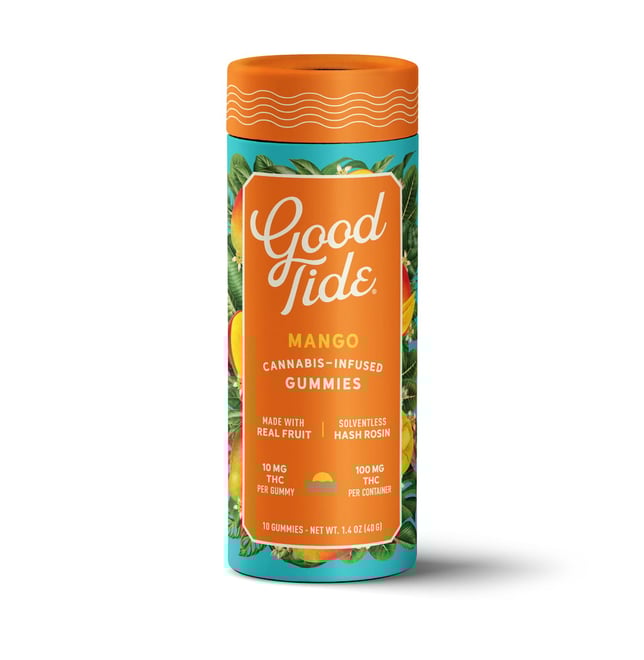 Vibe out with Good Tide mango gummies. Naturally rich in myrcene, real mango makes an ideal match for our indica-leaning rosin. With naturally occurring terpenes and minor cannabinoids present in the solventless hash rosin, these mango gummies are dripping with relaxing plant properties to produce a mellow, laid back high. Unwind and drift into a tropical state of mind with a 10mg gummy. Contains 10 gummies, each with 10mg THC.